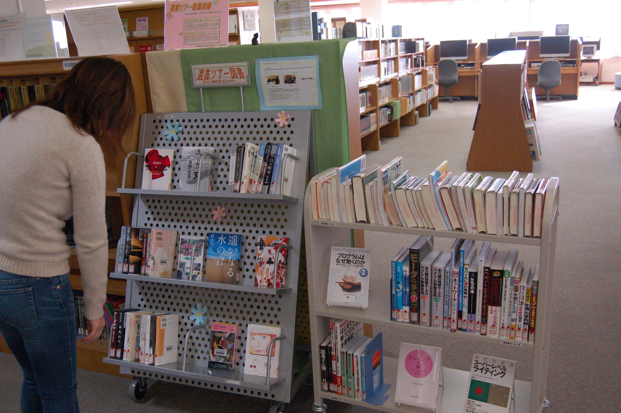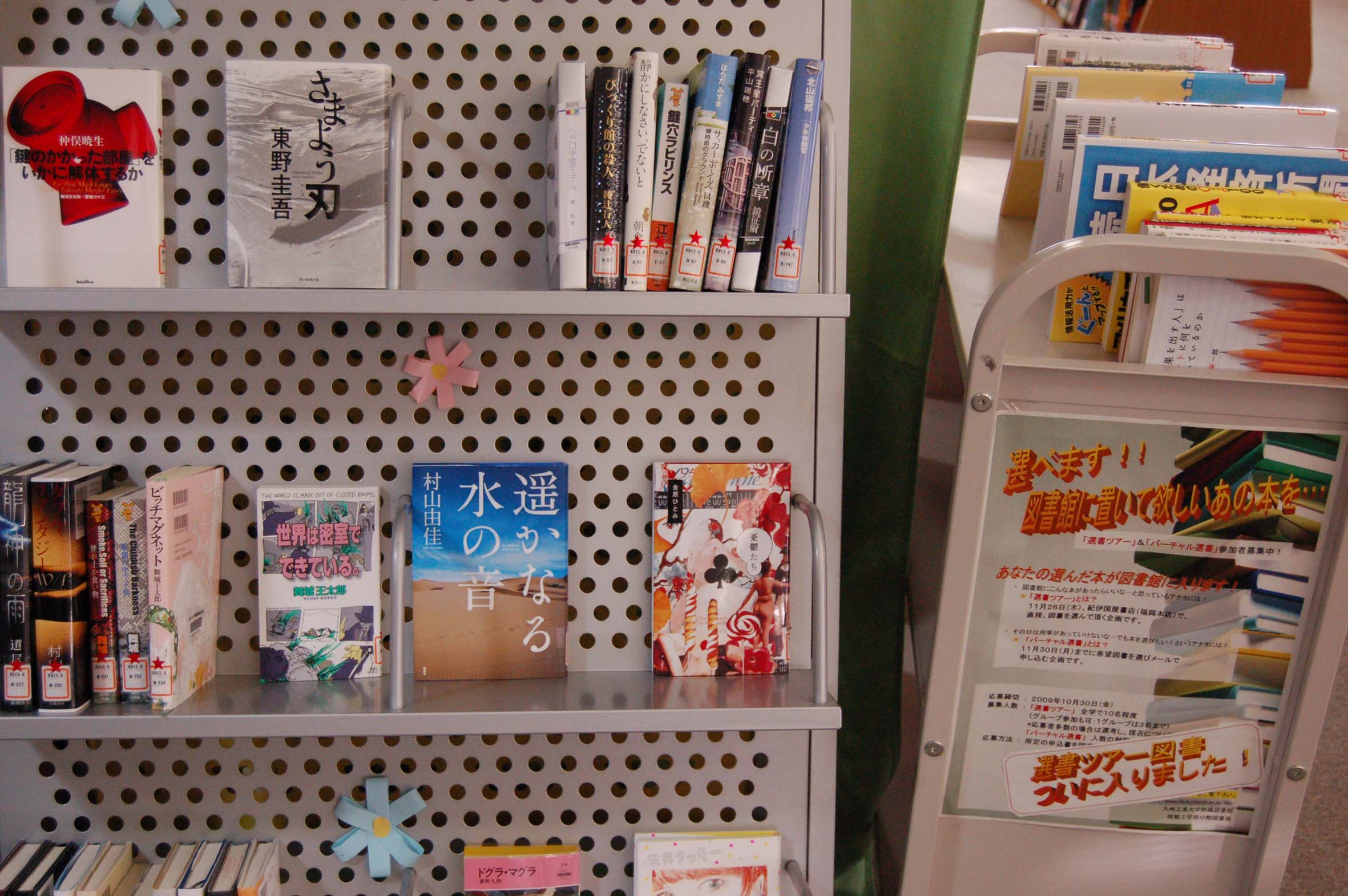 選書ツアーでの選定図書の整理が終わりました。図書館でコーナーを設けています。選定した方以外も是非ご利用下さい。 参加者からの感想文と推薦文の一部を紹介します。図書選びの参考にどうぞ。 ■選書リスト■ ■感想文■ ■図書館にはまだまだ読みたい専門書が足りないと感じることがあったため、読みたい本を入れてもらえるとのことなので選書ツアーに参加しました。 実際に本の中を見ながら選べる点は良かったのですが、置いてある専門書がもっとあればよかったこと、中身を確認しながら選ぶには時間が少し短かく、もっとじっくり選びたかったことを残念に思います。 バーチャル選書で選びましたが店に洋書がなかったことも残念です。 ネットワークセキュリティ関係の本は,これまで図書館に少ししかなかったため、選んだ本が図書館に入ってくるのを楽しみにしています。 ■図書館というのは自分が読みたい本を読めるという場所で、それだけならばそのへんの本屋さんとなんらかわりないのでしょうが、ルールさえ守れば「無料で」本を読める、本屋さんであればその本の代金を支払わなければなりませんから、やはり図書館の存在価値というのは本好きにとっては非常に大きなものだと思います。そのかわり本屋では購入した本は自分の物になり、そこは借りた本は返さなければならない図書館とは違うのですが、「物語を読む」という行為にだけ際して言えば、結局は同じことでしょう。そういう図書館に自分が読みたい本が無いという場合、これはもう購入するかあきらめるしかないのでしょうが、第三の選択肢としてこの選書ツアーがあります。図書館にいれたい、自分が読みたい本を大きな本屋で購入でき、しかも一人あたりの予算も十分にあり、大量に小説を購入するのも可能ですし、高価な参考書を購入するのも可能です。 正直、実際の予算が予想していた額を大幅に上回ったので、本当に好きなだけ選書することができました。もし次回があるのならば、また参加したいと思いました。 ■自分が今回の選書ツアーに応募したのは、研究に関する読みたい専門書(モータやメカトロに関する書籍)と好きな作家の読みたい文芸書が図書館で見つからなかった時に偶然に図書館に張ってあったポスターを見たからです。また、実際に参加させてもらって実際に大型書店で色々な本を手にとって見て、選書することができたのはすごくよかったです。具体的には中身を確認できるので分かりやすい本を選べたところ、選書を行った書店が専門書が多かったところが特に自分は良かったと思いました。 ■今回、選書ツアーに参加することができてとても良かったと感じております。普段、図書館を利用していてこんな本があったらいいなという希望を具体的に選書という形で実現できたからです。特に、いつもなら立ち読みしかできないような高価な書籍も自分の手で選び、購入することができて大満足、もう言うことも思い残すこともなしでした。選んだ書籍の中には若干自分の趣味の世界が入っているものもありますが、多くの人が図書館を通じて自分の選んだ本を読んでいただけるといいなと思います。来年もあったらぜひ参加したいと思います。 ■推薦文■ 大学生の恋の話。それだけ書けば平凡な恋愛話になると思われるかもしれませんが、実際、そんなもんでもないです。 大した分量も無い短い話ですし、さらっと読もうと思えば読めるのでしょうが、さらっと読むのは勿体なく、時間をかけて一文一文、雰囲気や感情に浸りながら、少し多めの行間を味わいながら、いたい描写を噛み締めながら、読んでほしい話です。 ■Google Androidアプリ開発ガイド / 柳井政和著 androidと言えば最近普及してきたスマートフォンの基本ソフトですが、この本を参考にしながら、自分でandroid携帯用のアプリを作ってみてはいかがでしょうか? androidの携帯電話を持っていなくてもパソコンで動作するエミュレータで開発できますよ!! ネットワークの仕組みに関して,わかり易い図付きで解説してあります。 この本を読めばネットワークの実践的な知識が手に入るかも。 同シリーズ?としてLinuxの教科書もありますが、図書館にも置いてあり、こちらも良い本なのでぜひ!! ■日本テクニカル分析大全 / 日本テクニカルアナリスト協会編 テクニカル分析とは、株や為替相場の過去から現在までの値動きを利用して未来の値動きを予測する手法です。 移動平均などもテクニカル分析のひとつになります。この本の第3部がおすすめです。 私は株取引を行なっているため興味を持ちましたが、テクニカル分析で用いられている手法には、研究などでも応用できるところが結構あります。 おもしろいので勉強してみては!! ■ハッキング非公式ガイド : 天才ハッカーから学ぶ攻撃と防御 / アンキット・ファディア著 九工大図書館には、なぜかセキュリティ関係の本が少ない?自分が知らないだけですか? この本ではいろいろな攻