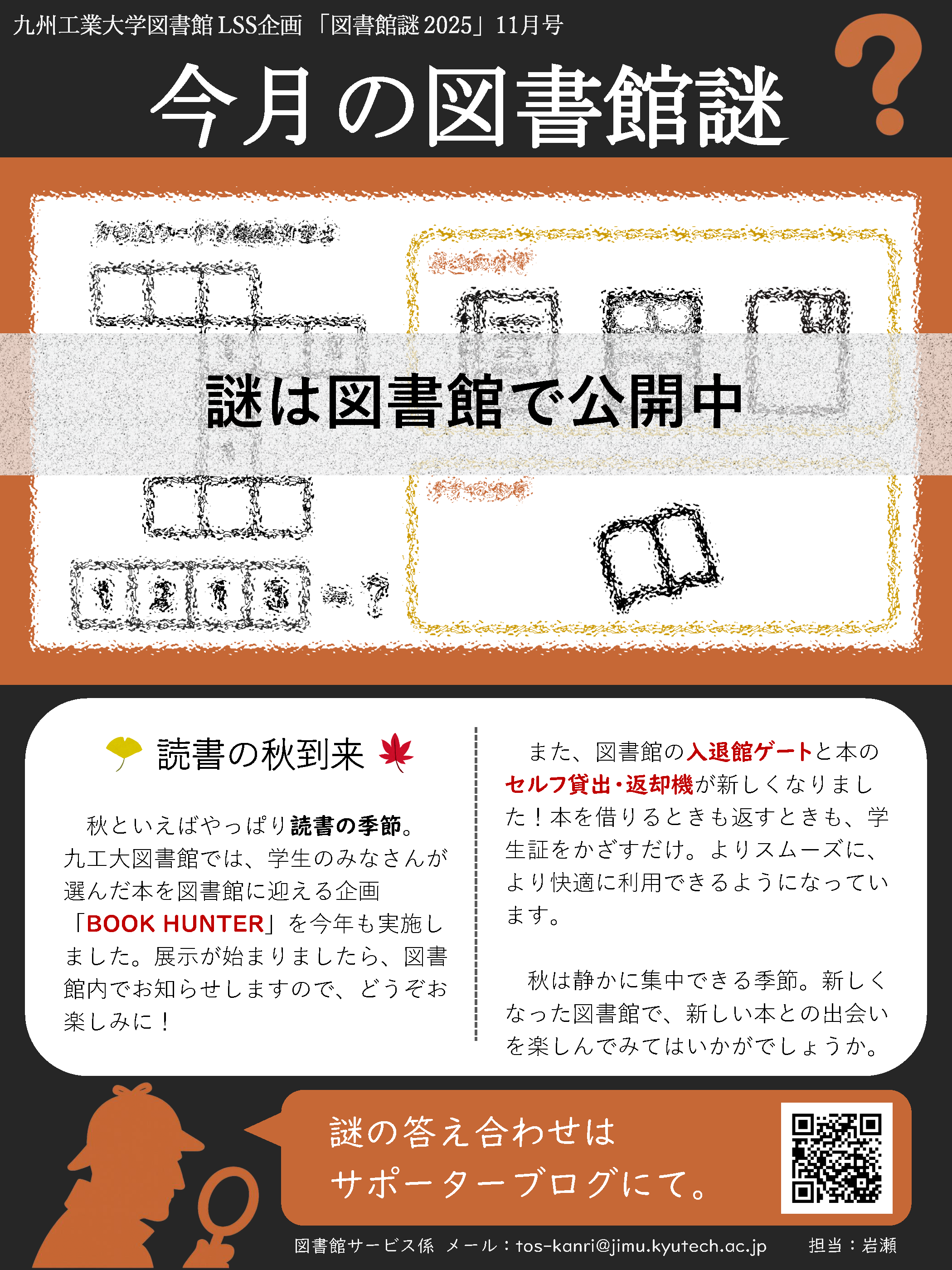 【戸畑本館】LSS企画「図書館謎2025」11月号公開 2025/11/04(火) - 13:12 イベント 図書館学生サポーターによる、戸畑本館のイベントや施設紹介をテーマに毎月謎解きをお届けする企画「図書館謎2025」! 今回のテーマは「読書」。読書の秋と謎解きの秋。どちらも図書館で楽しめます! 館内でぜひポスターを探してみてください。 図書館謎の出題状況やヒントなどはサポーターブログでご確認ください。 図書館学生サポーターブログ:【図書館謎2025】 ポータルページ すべてのINFORMATIONを見る