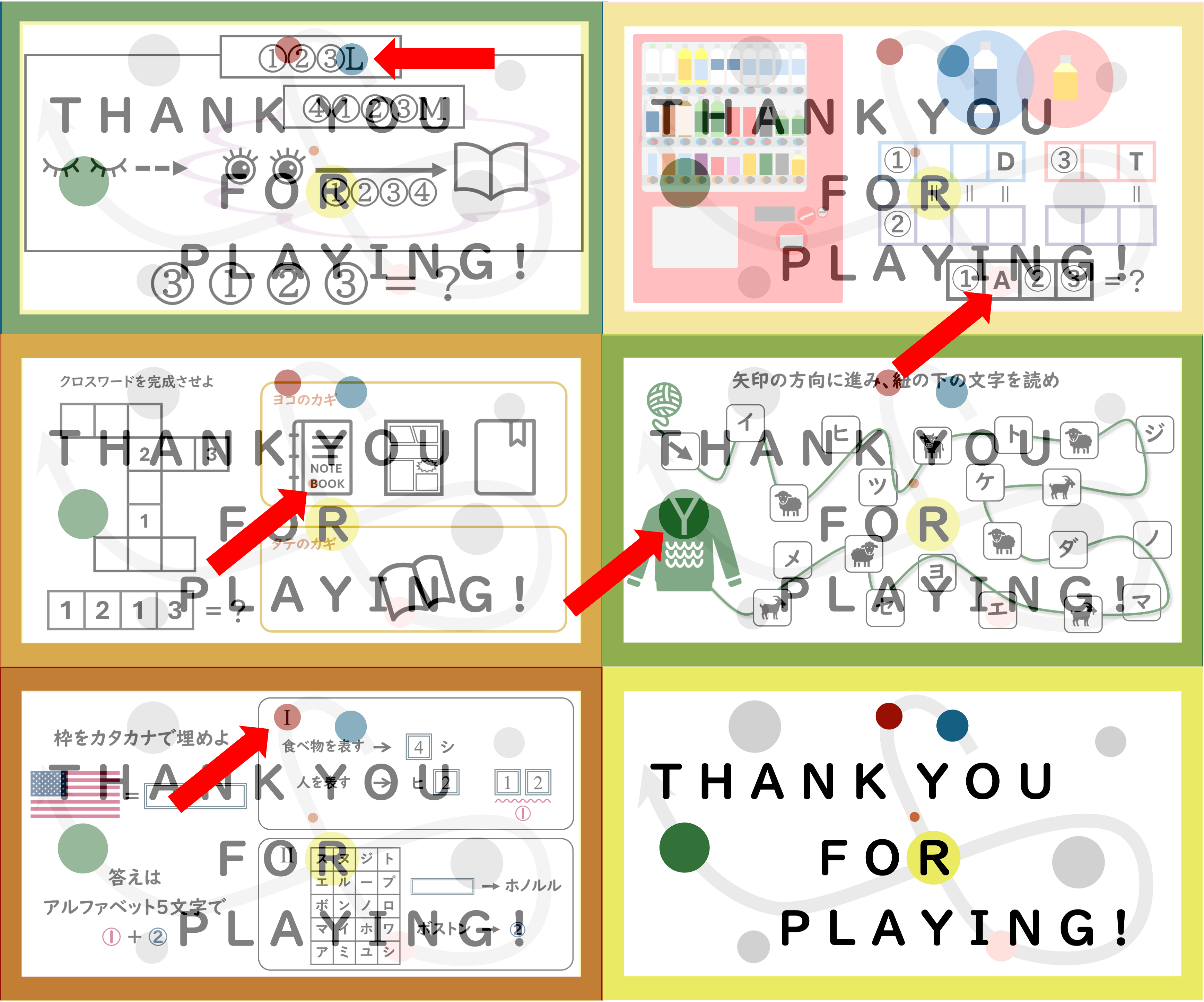 色付き丸に使われていた色は、この図書館謎2025企画の各問題の枠の色でした。