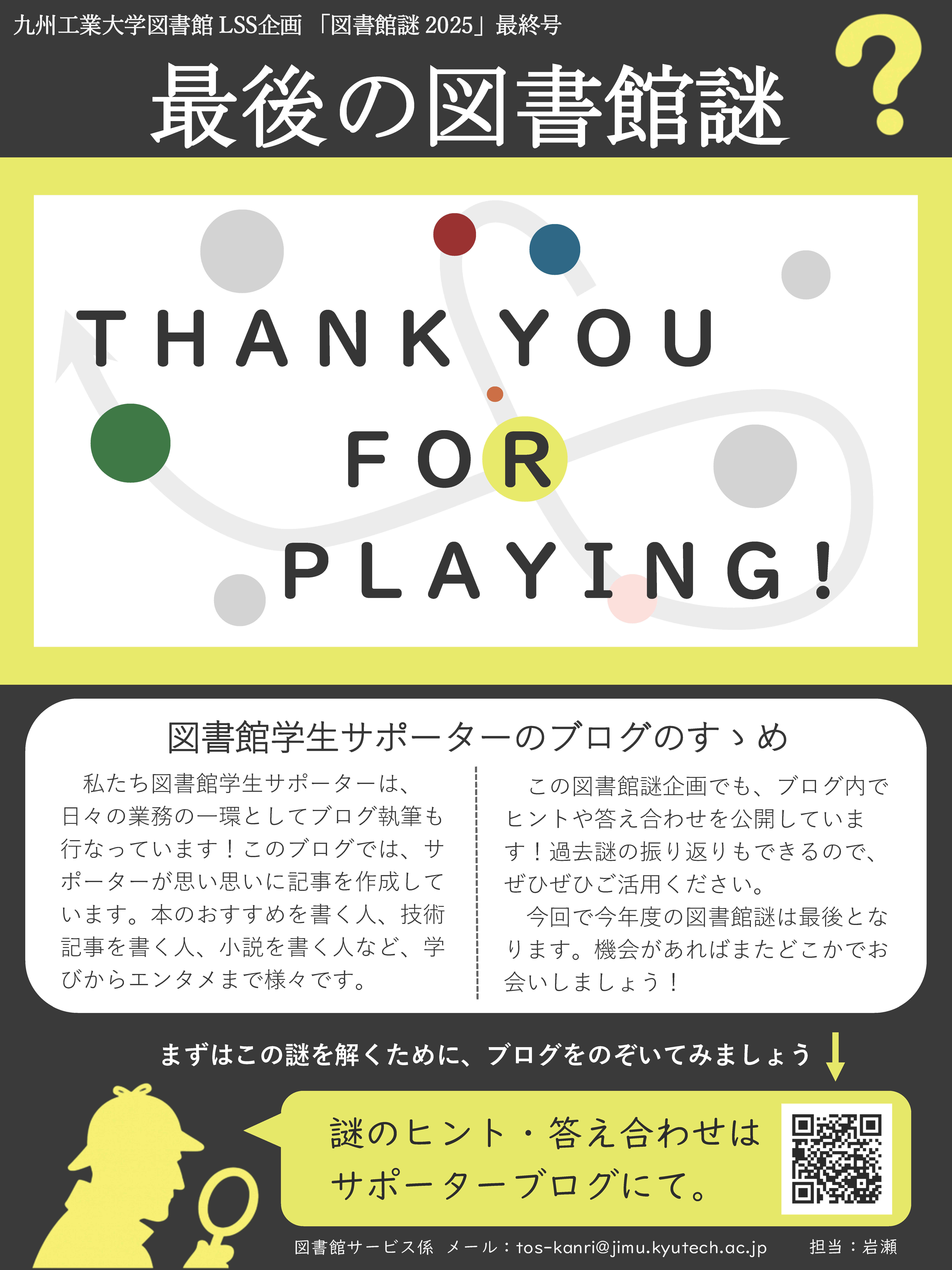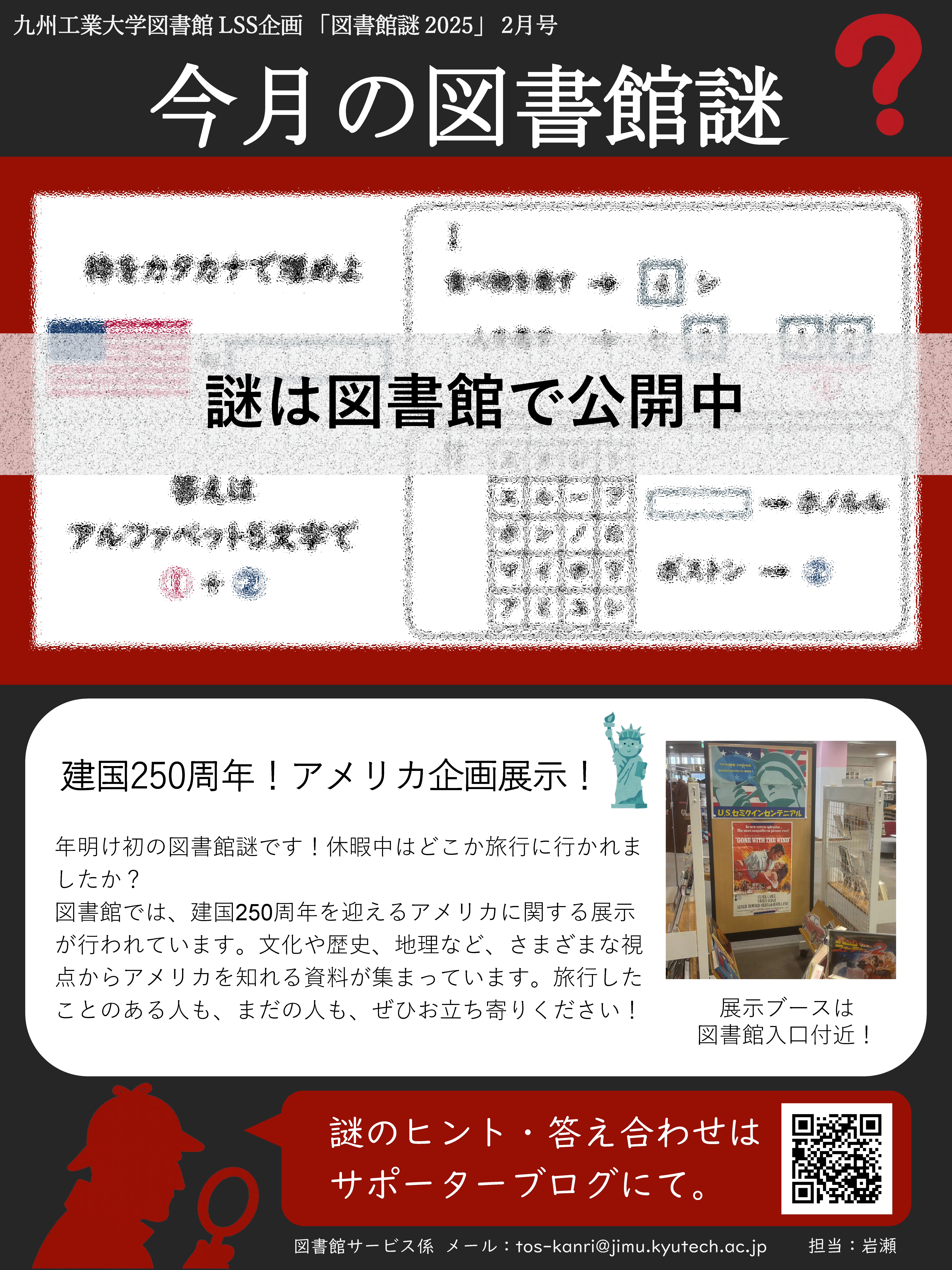 【戸畑本館】LSS企画「図書館謎2025」2月号+最終号公開 2026/02/10(火) - 16:09 イベント 戸畑本館のイベントや施設紹介をテーマに毎月謎解きをお届けする企画「図書館謎2025」の2月号+最終号が公開されました! 今回のテーマは「アメリカ」。全ての伏線を回収する謎を解きに来て下さい! 館内でぜひポスターを探してみてください。 図書館謎の出題状況やヒントなどはサポーターブログでご確認ください。 図書館学生サポーターブログ:【図書館謎2025】 ポータルページ タグ LSS主催 すべてのINFORMATIONを見る