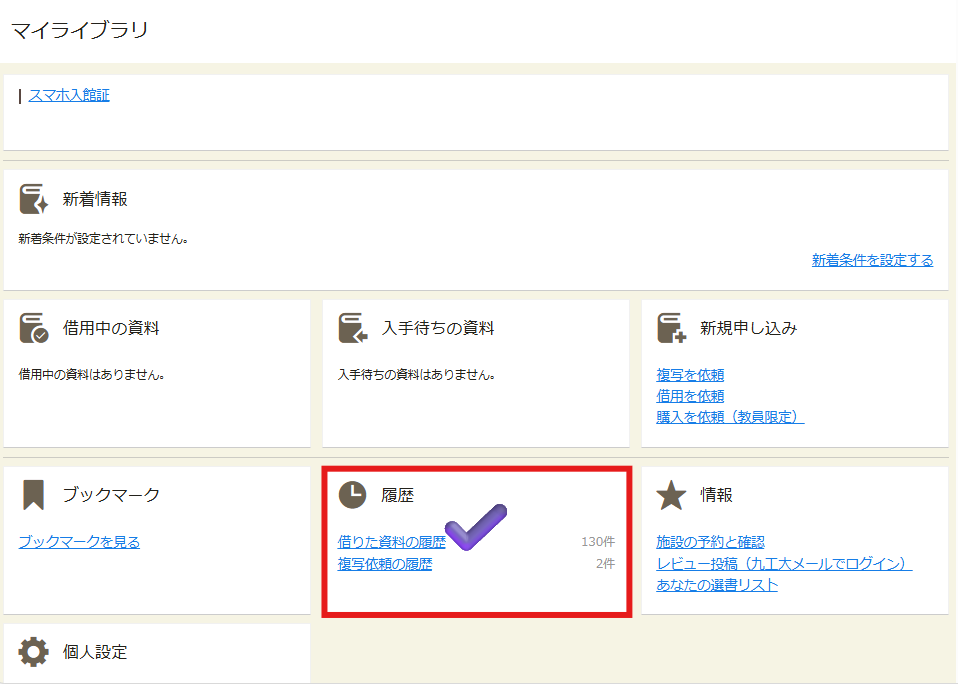 2. 「履歴」メニュー内の「借りた資料の履歴」をクリック