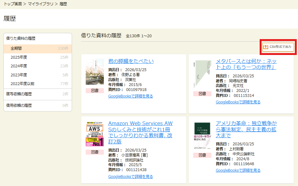 マイライブラリの「借りた資料の履歴」から、過去に借りた資料の情報を、ファイルでダウンロードできるようになりました。