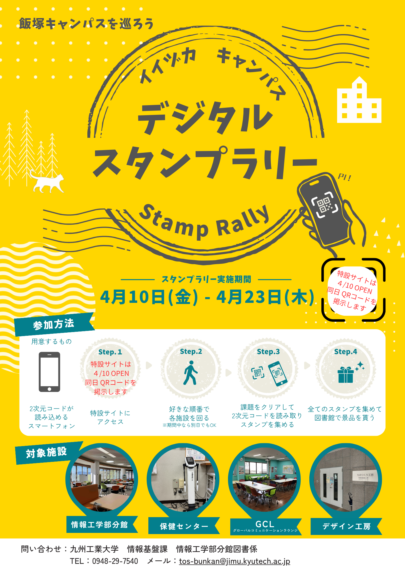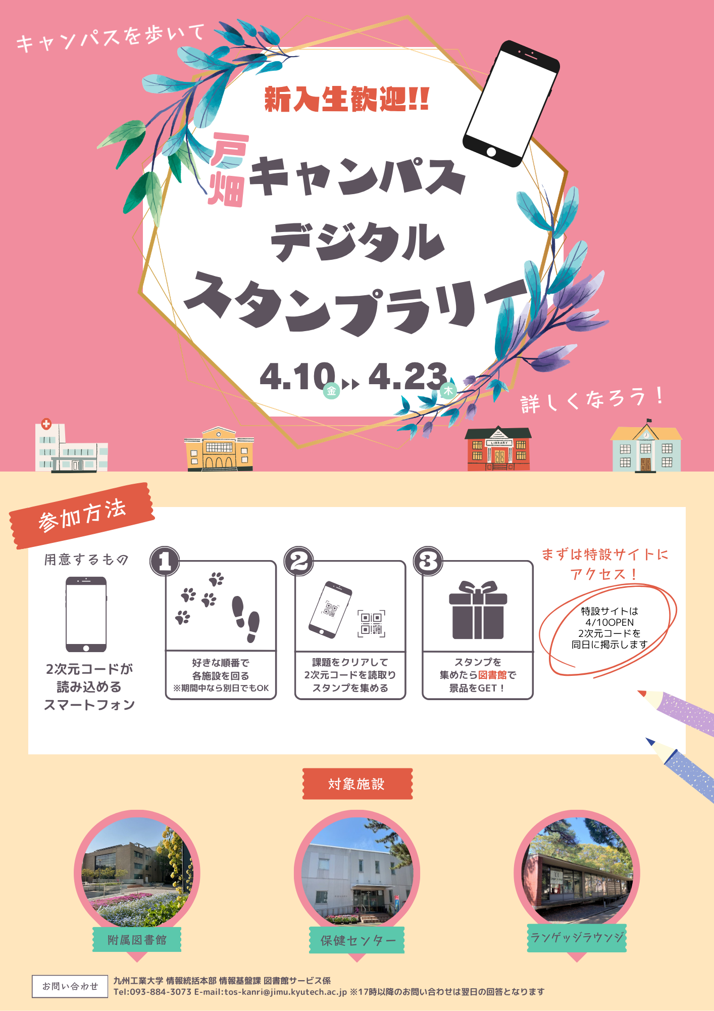 4月10日(金)から23日(木)にかけて、新入生歓迎企画として戸畑キャンパス・飯塚キャンパスそれぞれでデジタルスタンプラリーを開催します。