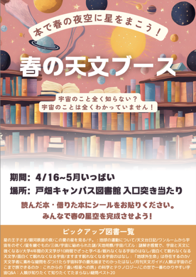 自己紹介 新規図書館サポーター 佛田亜成 こんにちは! 今年から図書館サポーターになりました。宇宙システム工学科 機械宇宙システム工学コース B4 赤星研究室佛田 亜成 (Butsuda Asei)です。1Qは 月曜日:9:00〜11:… |